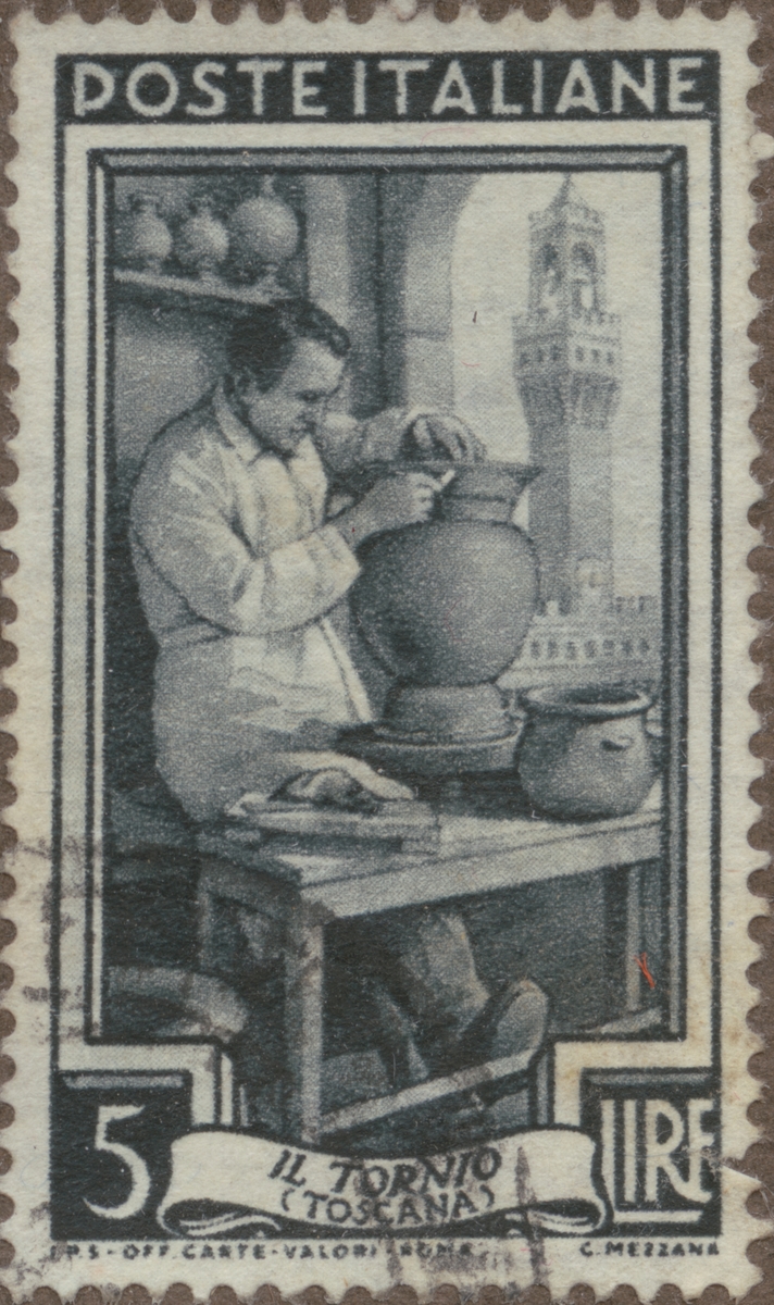 Frimärke från Italien, 1950. Motiv av keramikarbetare i Toscana.