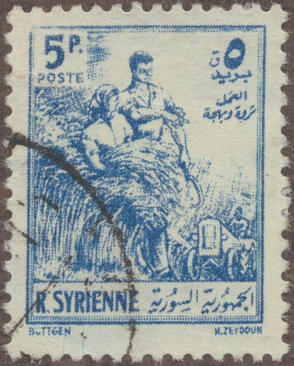 Frimärke från Syrien, 1954. Motiv av Syriskt skördefolk i arbete Skäran i användning