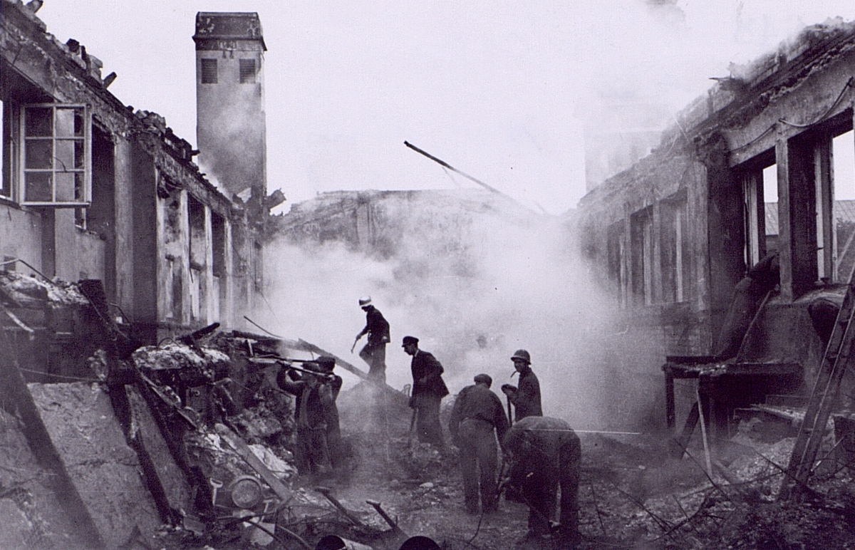 Branden i Västerås telefonstation den 22 sept. 1942. Röjningsarbete i telefonsalen.