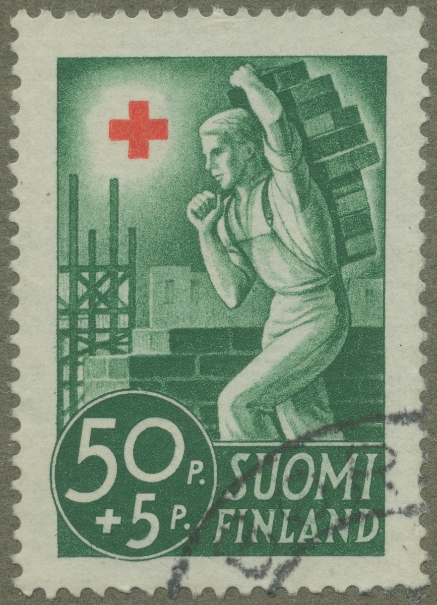Frimärke från Finland, 1941. Motiv av tegelarbetare. "till förmån för Röda Korset".