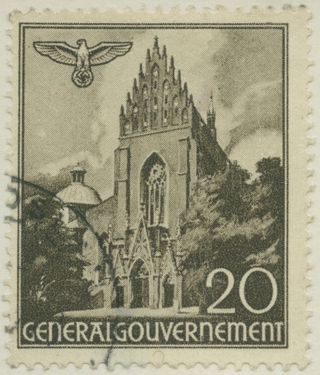 Frimärke från Polen, 1940. Motiv av Dominikanerkyrkan i Kraków. "Tyska ockupationen världskrig II".