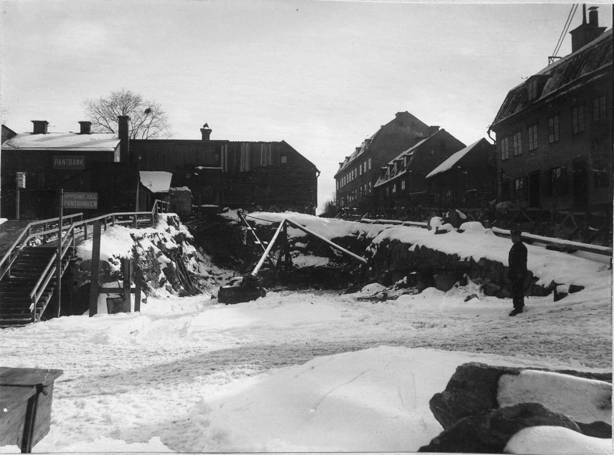 Bergssprängning vid Pantbanken på Götgatan i Stockholm 1909. Bild från tidskriften Hemmets bildmaterial.