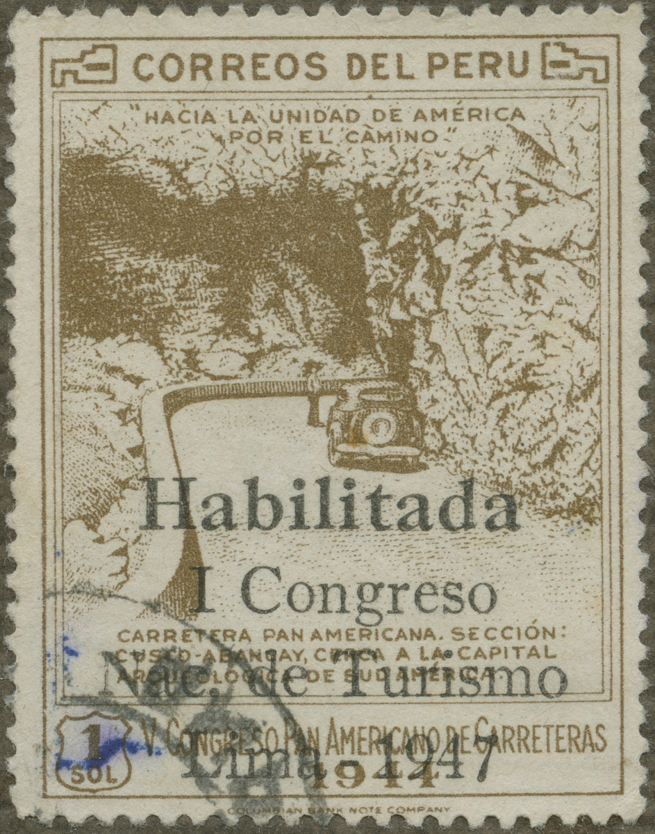 Frimärke från Peru, 1947. Motiv av Bergväg i Peru 1:sta nationella turistkongressen 5:te Vägkongressens ej utgivna märken