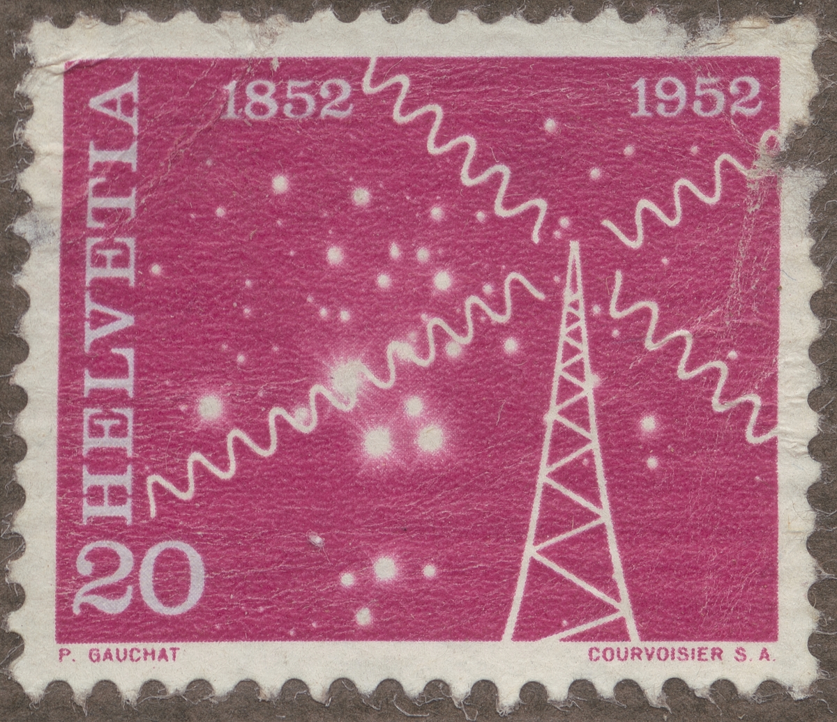 Frimärke ur Gösta Bodmans filatelistiska motivsamling, påbörjad 1950. Frimärke från Schweiz, 1952. Motiv av Radioutsändningar "Symbolisk bild Serie: 100 år av telekommunikation 1852-1952