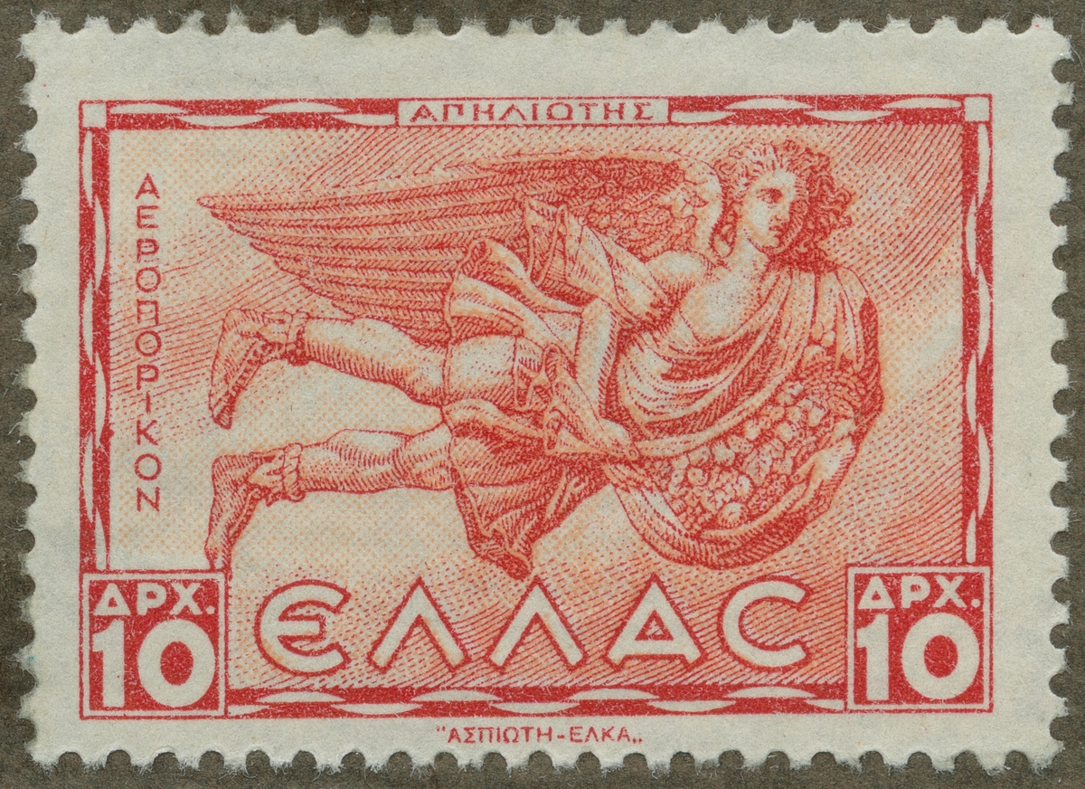 Frimärke ur Gösta Bodmans filatelistiska motivsamling, påbörjad 1950. Frimärke från Grekland, 1942. Motiv av Östanvinden "Apiliotis" Flygmärke"