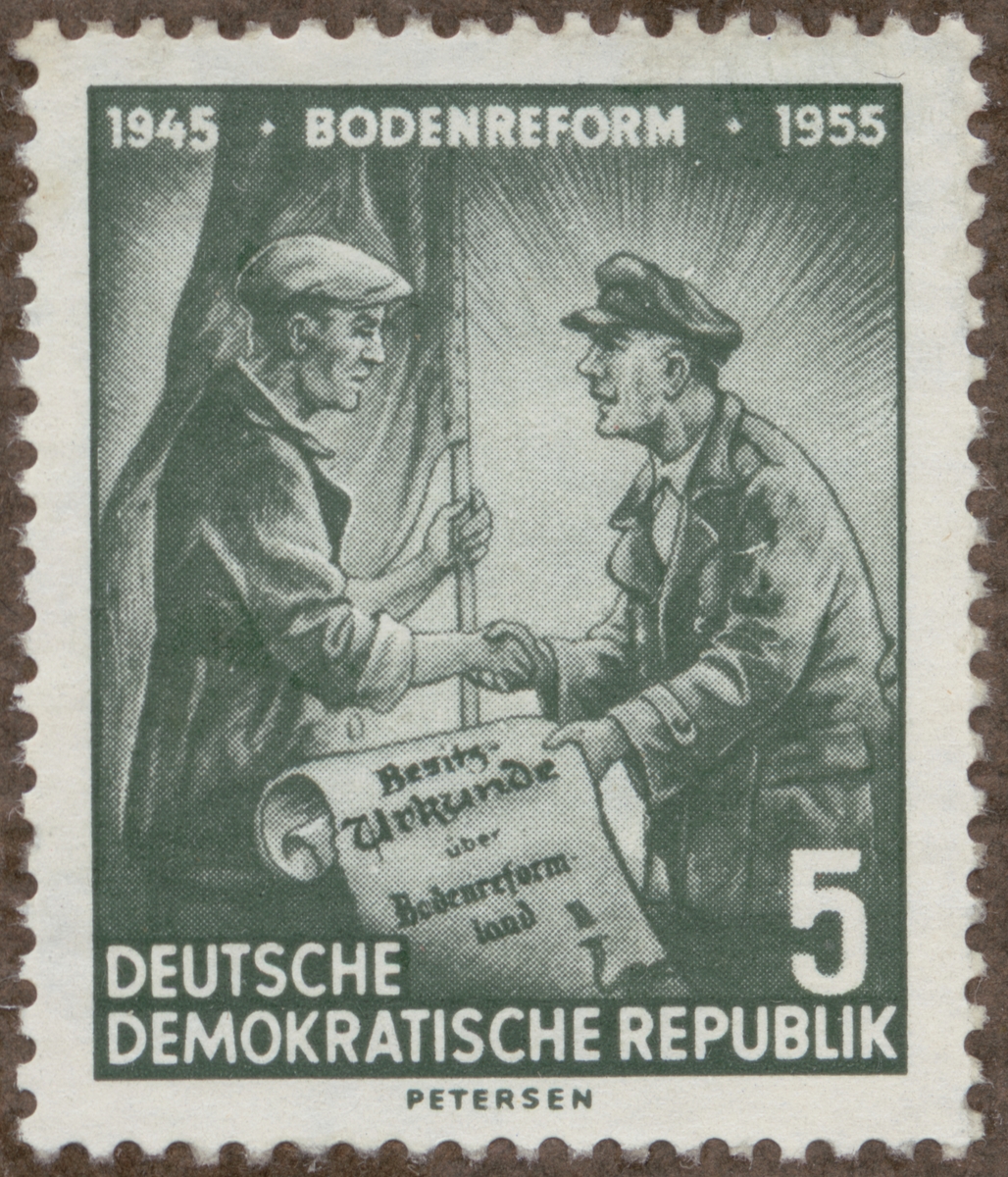Frimärke från Östtyskland, 1955. Motiv av Lantbrukare: Överlämnande av jordbesittningsrätt Bondereform 1945-1955