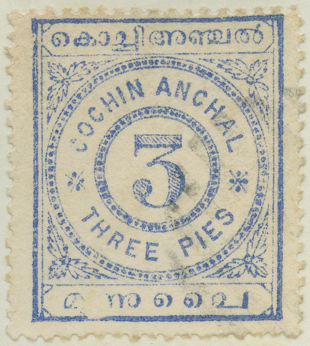 Frimärke från Cochin, 1898. Motiv av Indisk skrift