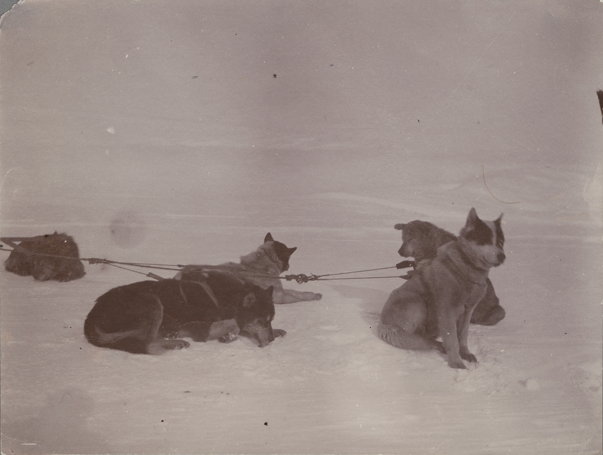 Fotografi från första svenska Antarktisexpeditionen 1901-1904. Motiv av hundspann som vilar i snön.