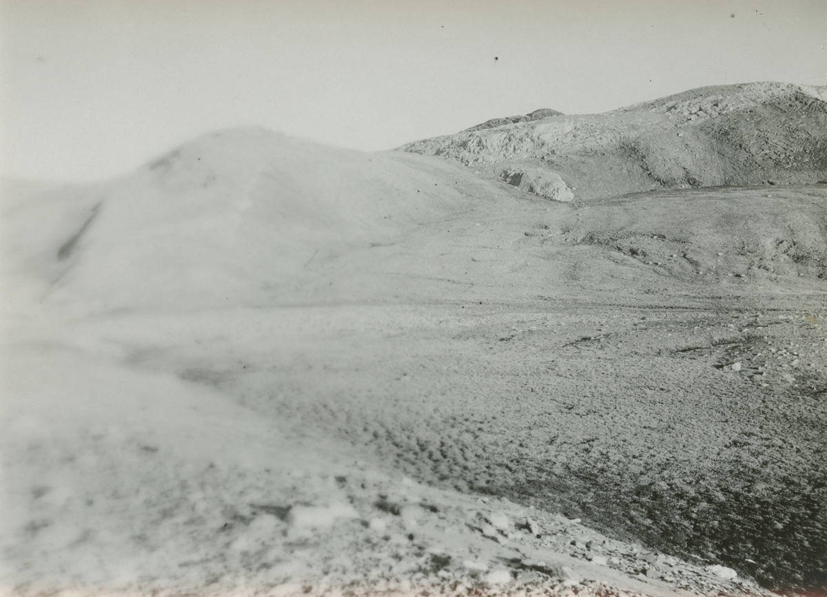 Fotografi från expedition till Östgrönland 1929. Dansk-svensk expedition under ledning av Lauge Koch. Svenska deltagare: Oscar Kulling och Helge Backlund. Vy över kargt bergslandskap.
