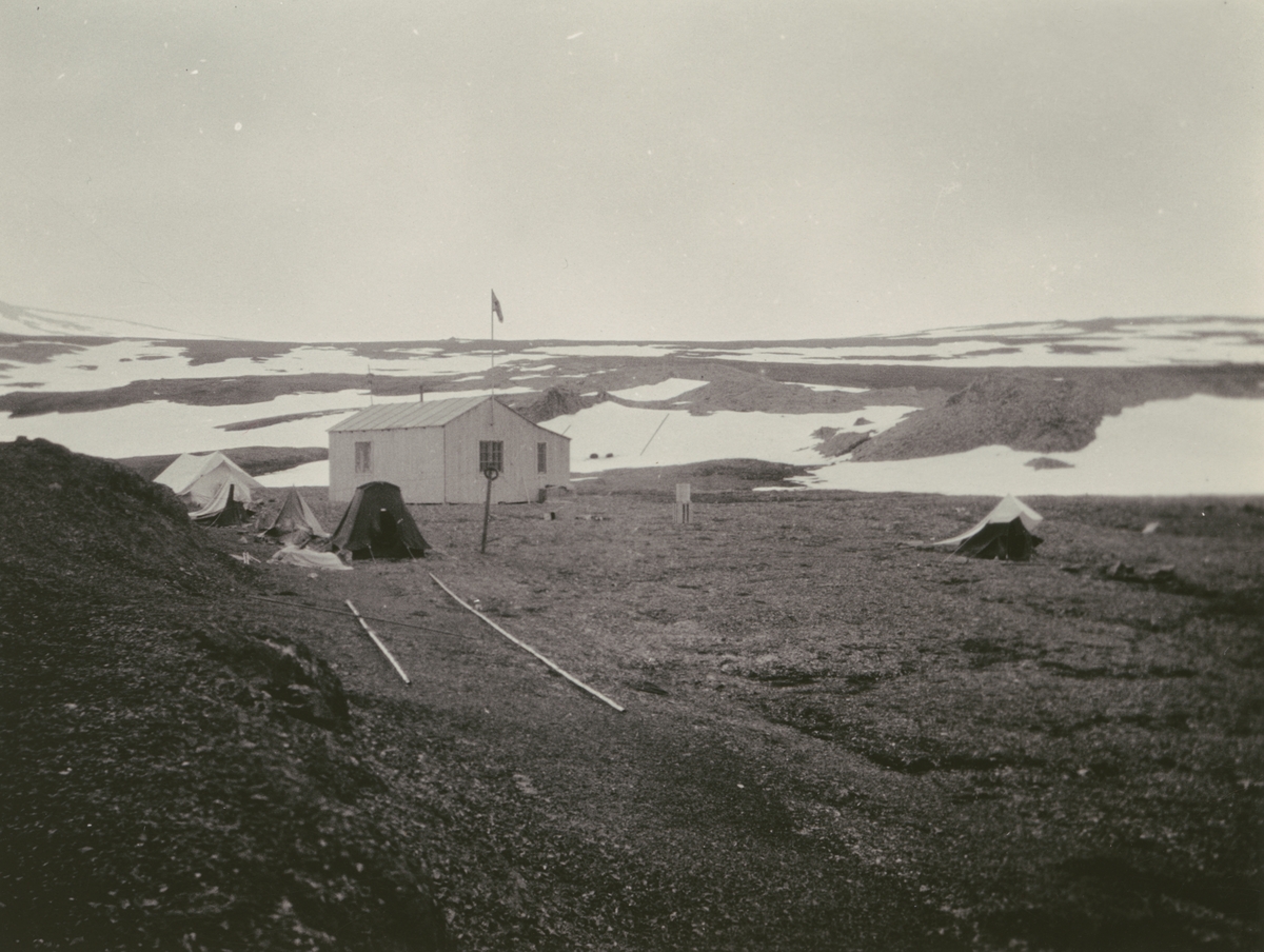 Fotografi från Ahlmannexpeditionen 1931. Motif of a small house and tents in a snow covered landscape.