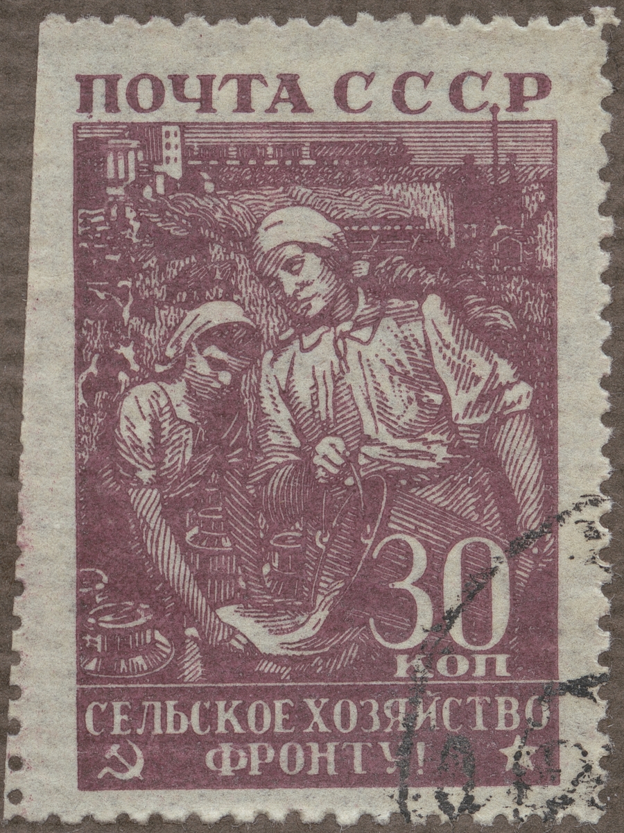 Frimärke från Ryssland, 1943. Motiv av mjölkproviantering.