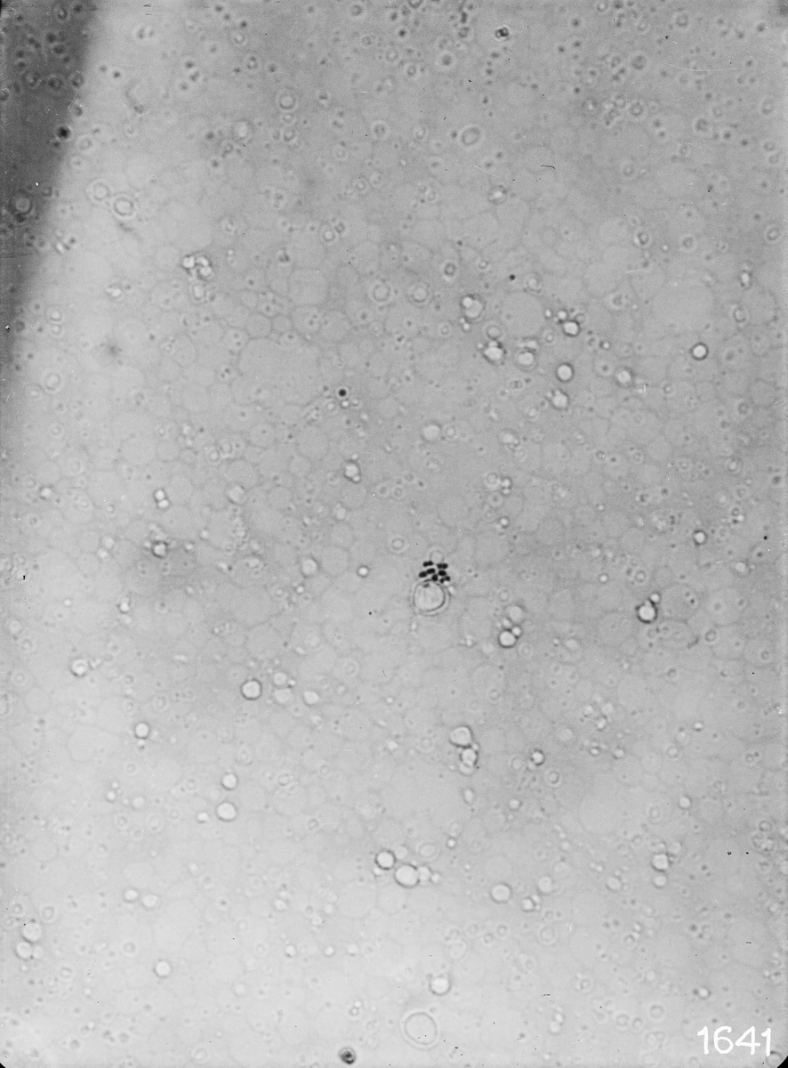 Mikrofotografering av mjölk. Mjölk förvarad 1 dygn i kylskåp. Prov nr. 14.