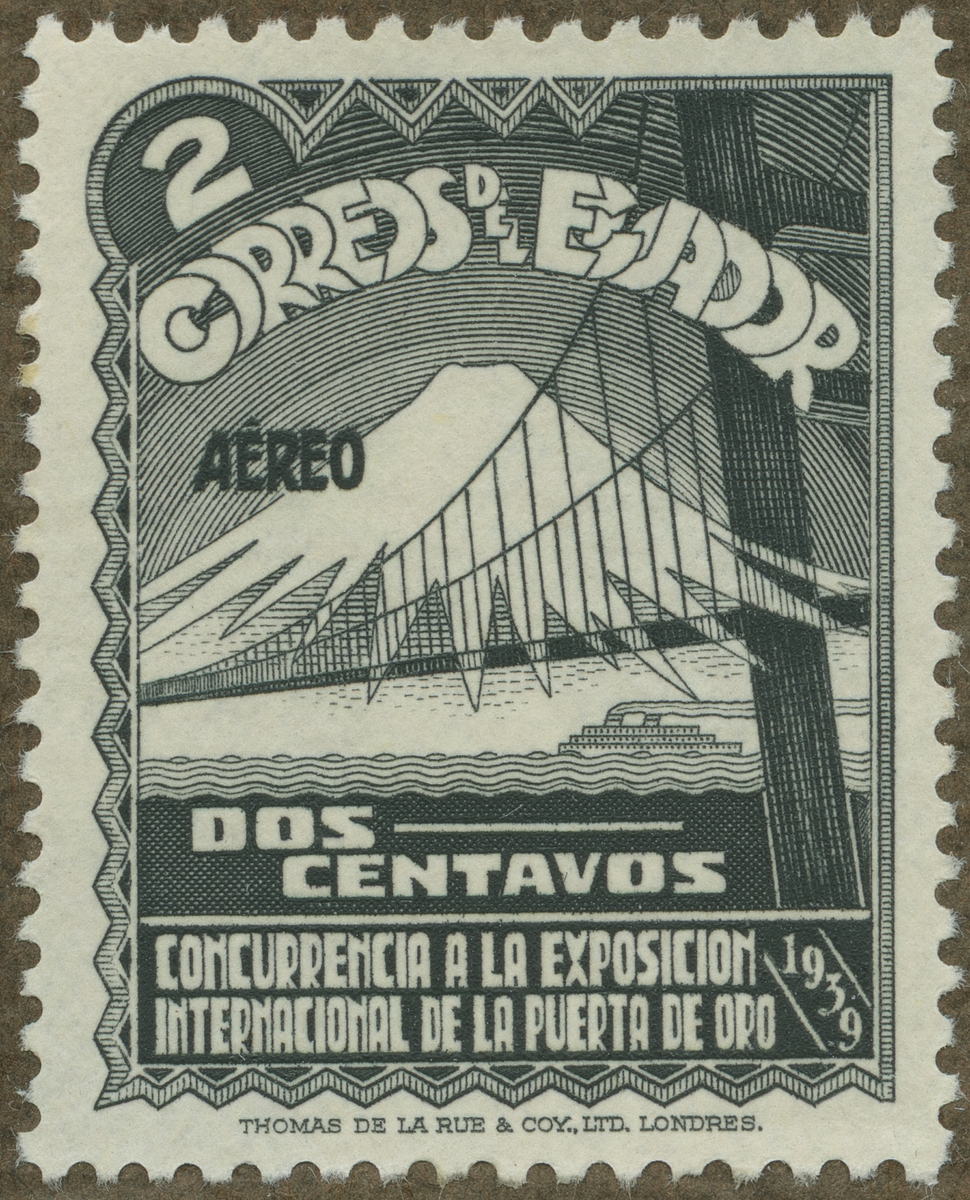 Frimärke ur Gösta Bodmans filatelistiska motivsamling, påbörjad 1950. Frimärke från Ecuador, 1939. Motiv av Snöklätt Berg "Internationell Utställning i San Francisco 1939"