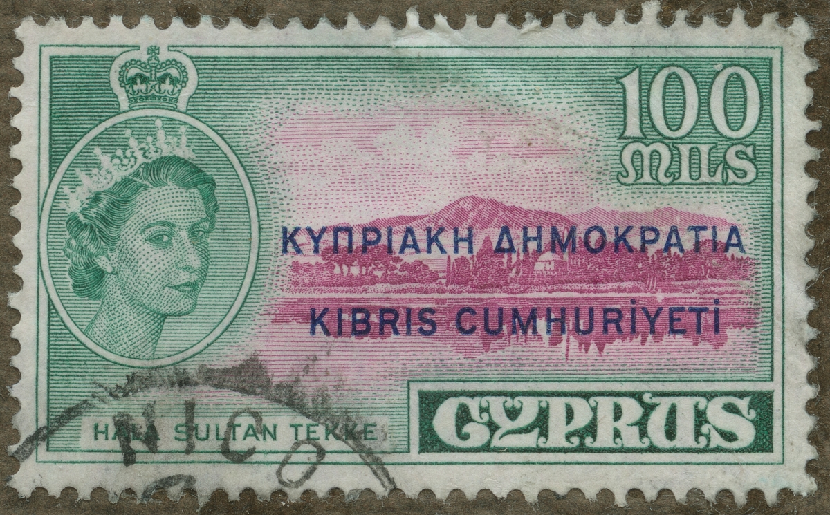 Frimärke ur Gösta Bodmans filatelistiska motivsamling, påbörjad 1950. Frimärke från Cypern, 1960. Motiv av Berget "Hala Sultan Tekke" "(t.v.) Drottning Elisabeth II av England. Cypern: brittisk kronkoloni 1925-1960. Blev självständig republik 1960. Frimärke av 1955 med grekisk och turkisk överstämpel. Cypernska republiken.