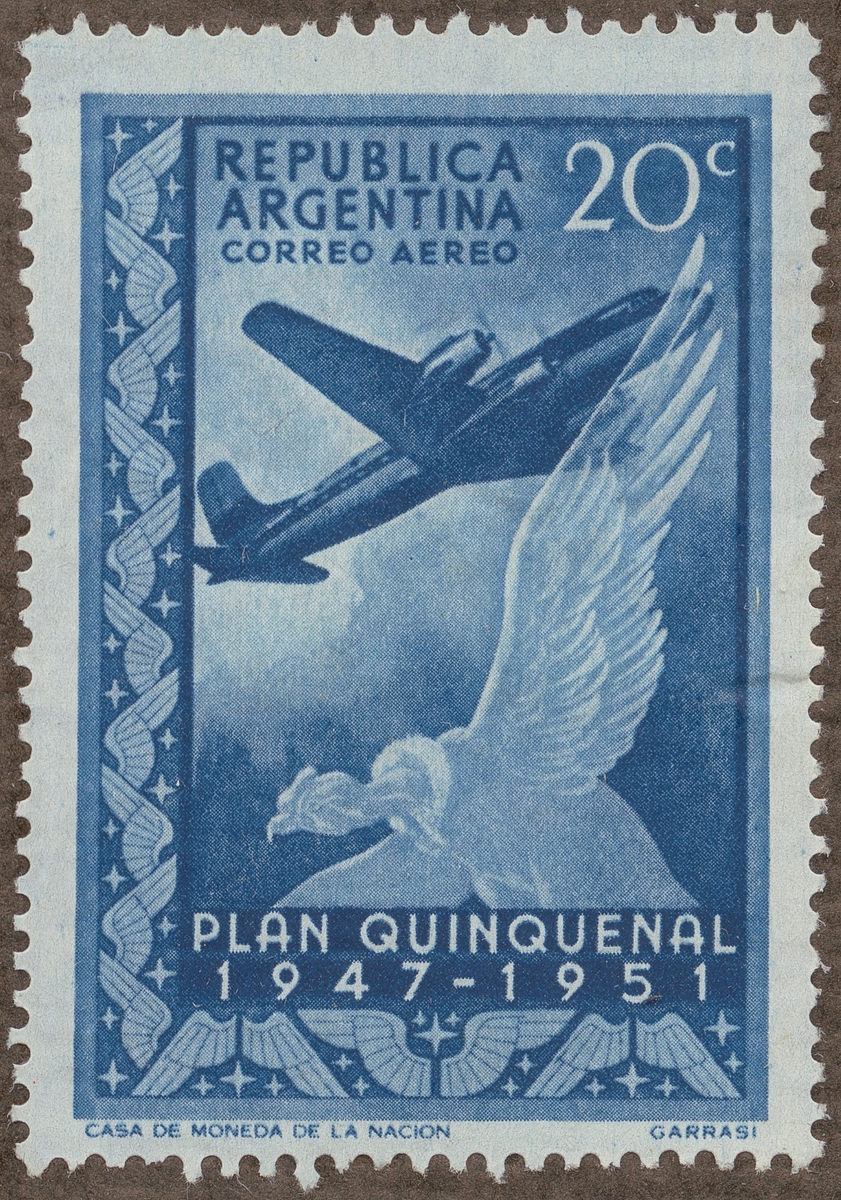 Frimärke från Argentina, 1951. Motiv av Flygande gam. Flygsymbol. 2-motorigt monoplan "-Minne om 5-årsplanen: 1947-1951-"