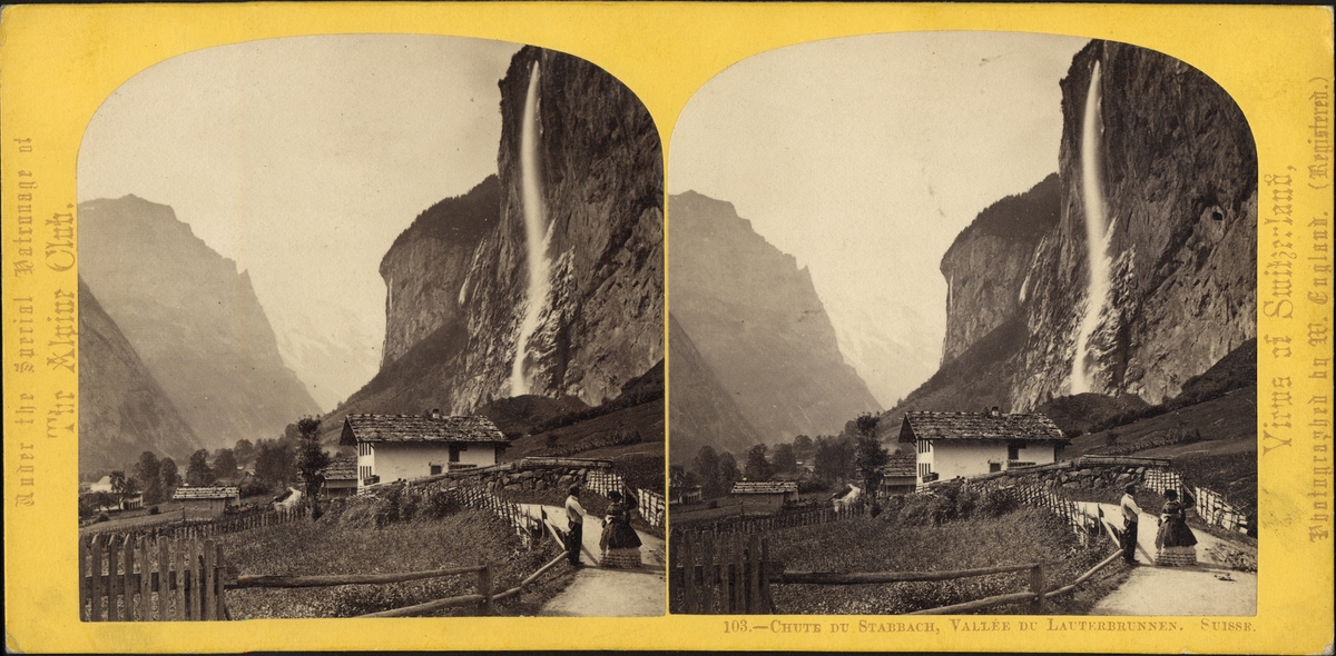 Stereobild, dal och vattenfall i Lauterbrunnen, Schweiz.