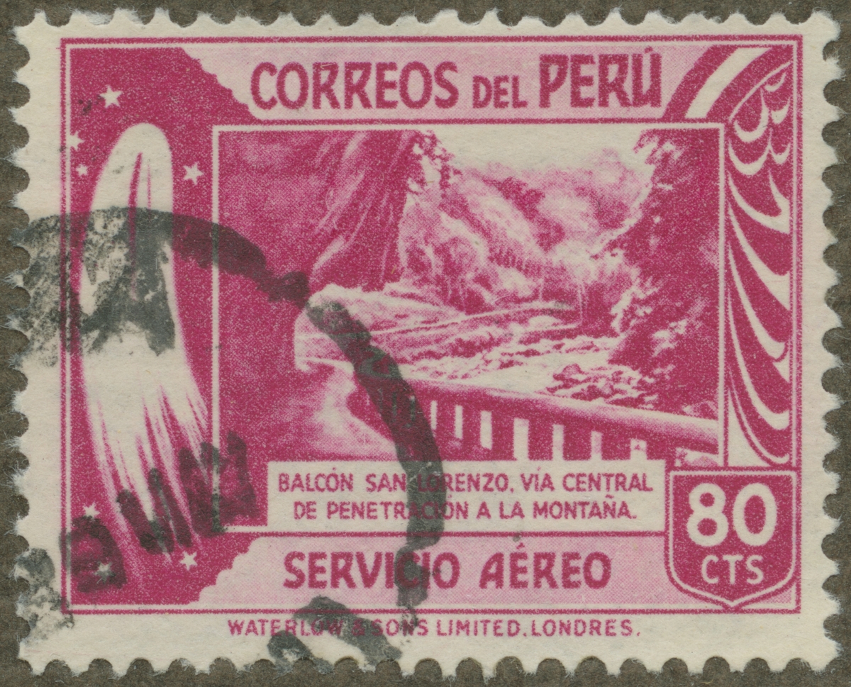Frimärke från Peru, 1938. Motiv av San Lorenzovägen i Peru