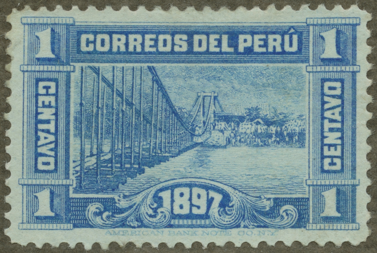 Frimärke från Peru, 1897. Motiv av Lång hängbro vid Paucartambo