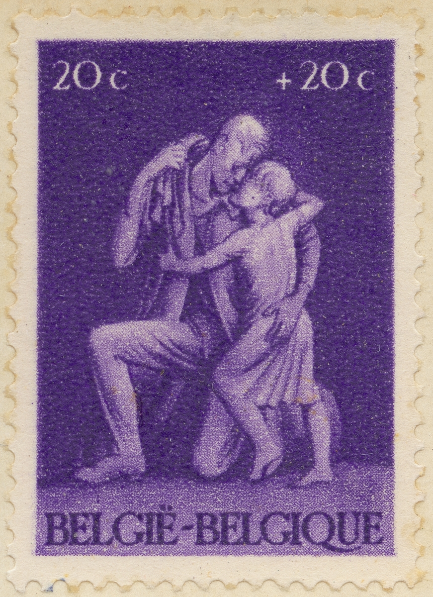 Frimärke från Belgien, 1945. Motiv av Krigsfångens hemkomst "Serie: Krigsoffren" Till förmån för krigsfångar, avrättades familjer samt partisaner.