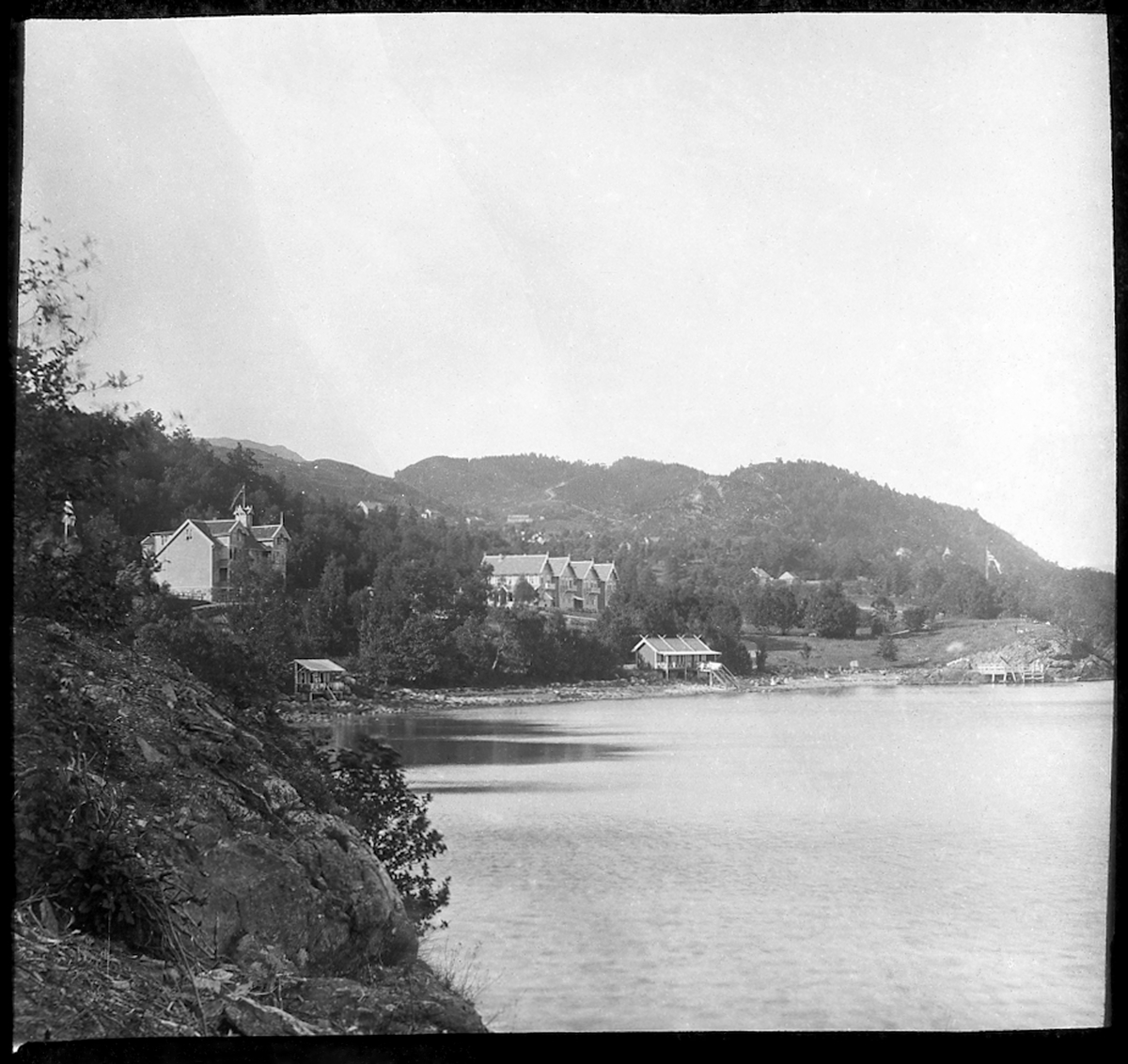 Skioptikonbild från institutionen för fotografi vid Kungliga Tekniska Högskolan. Motiv föreställande utsikt över havet mot berg. Bilden är troligen tagen av John Hertzberg under en resa i Sverige.