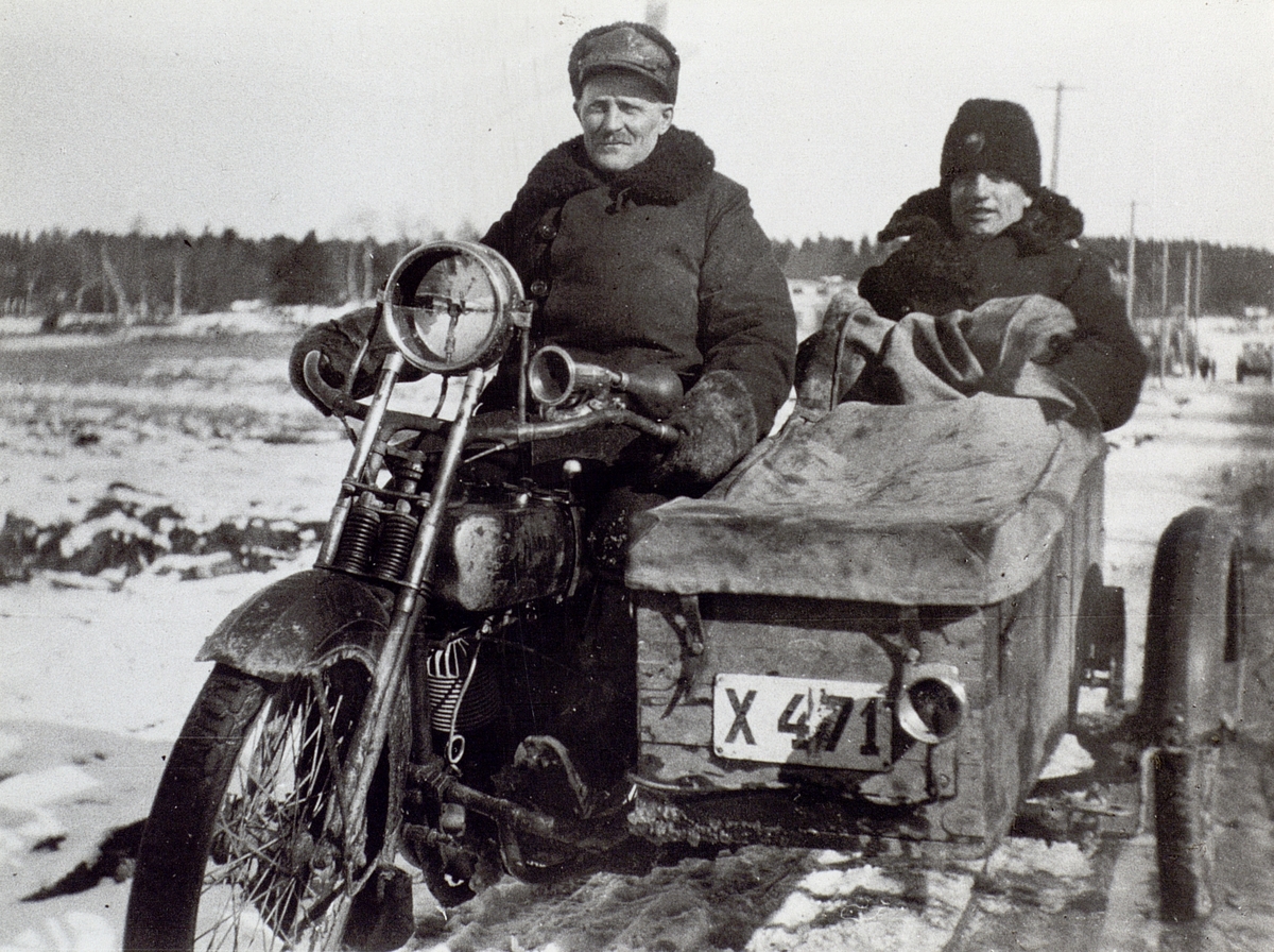 1920-talet. Erik Johan Larsson (Wia-Lasse), morfar till Jan-Erik Wik. I sidovagnen Sven Wallander. Motorcykeln är en Harley-Davidson -1925.