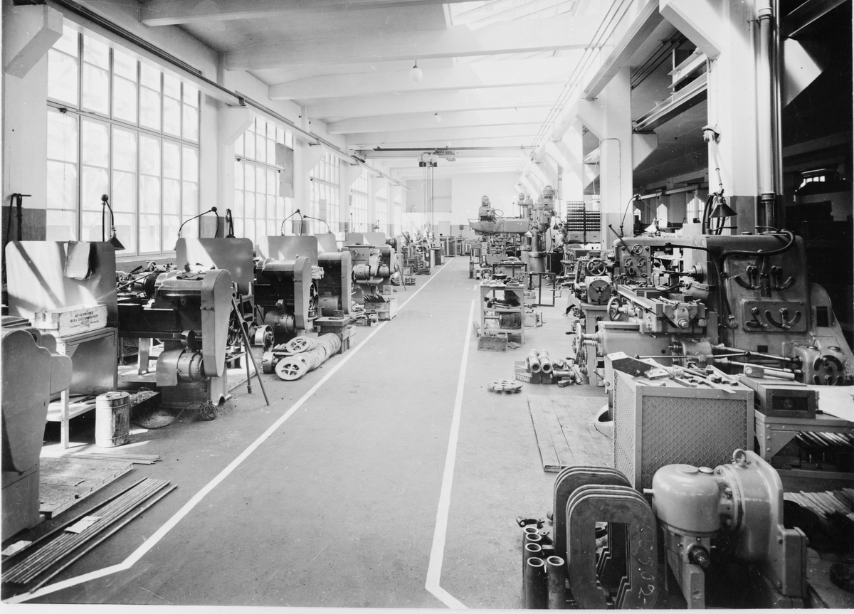Interiör av maskinhallen hos Asea Svetsmaskiners nybyggnad vid Hammarby industriområde.