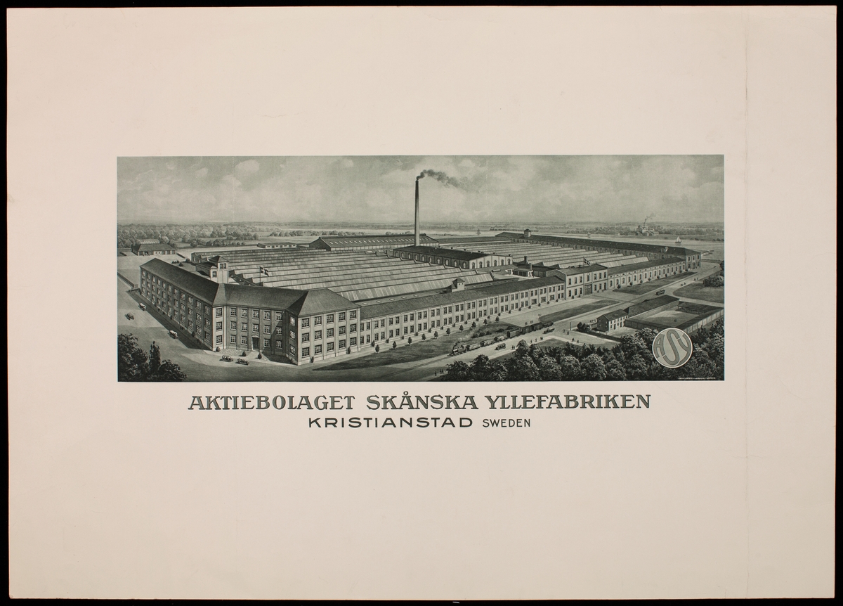 Plansch med motiv av Aktiebolaget Skånska Yllefabriken i Kristianstad.