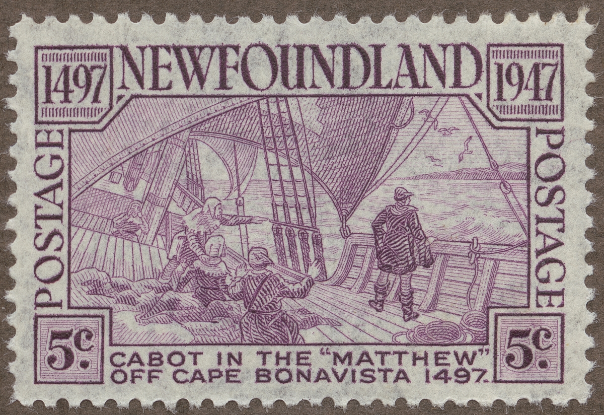 Frimärke från New Foundland, 1947. Motiv av Fartyget "Matthew" med John Cabot. 450-årsminne av upptäckandet av New Foundland: 1497-1947.