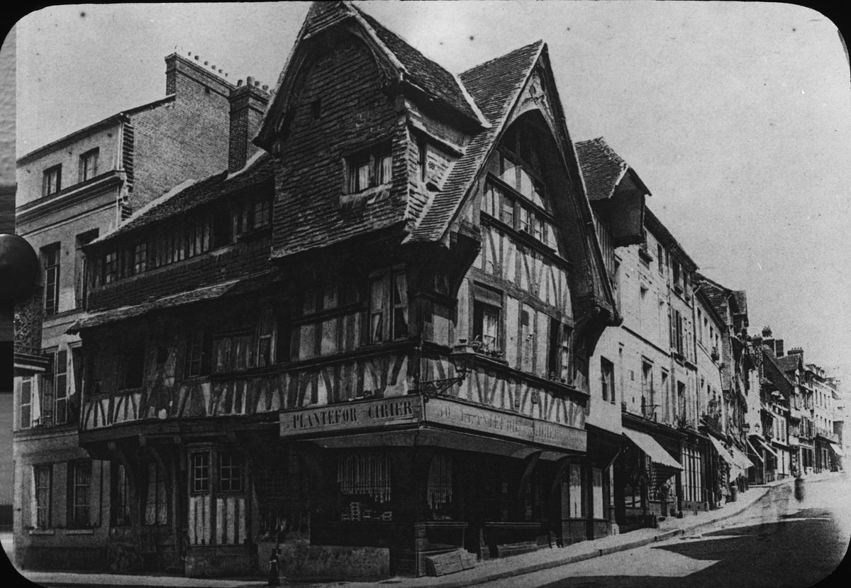 Skioptikonbild med motiv av Vieilles maisons på la Grande Rue i Lisieux.