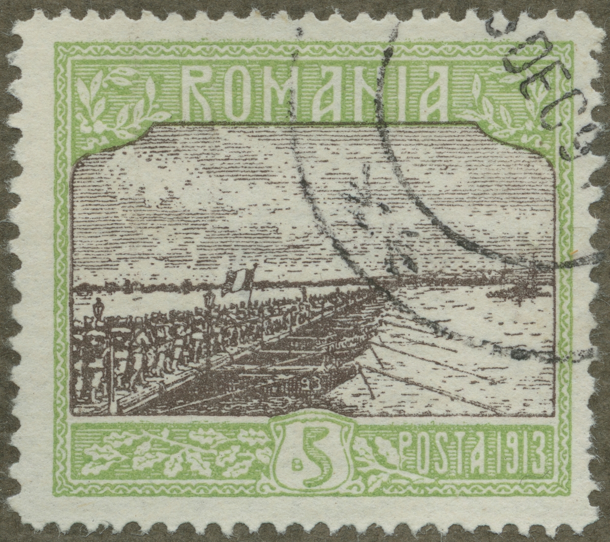 Frimärke från Rumänien, 1913. Motiv av Pontonbro över Donau Minne av Silistriens erövrande