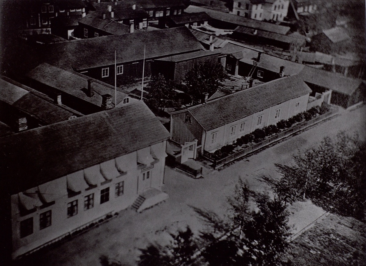 Luleå. I huset nederst till vänster Norra Kyrkogatan 41, inflyttade Telegrafen den 21/9 1857. Var där till staden brann ned den 10/6 1887.
