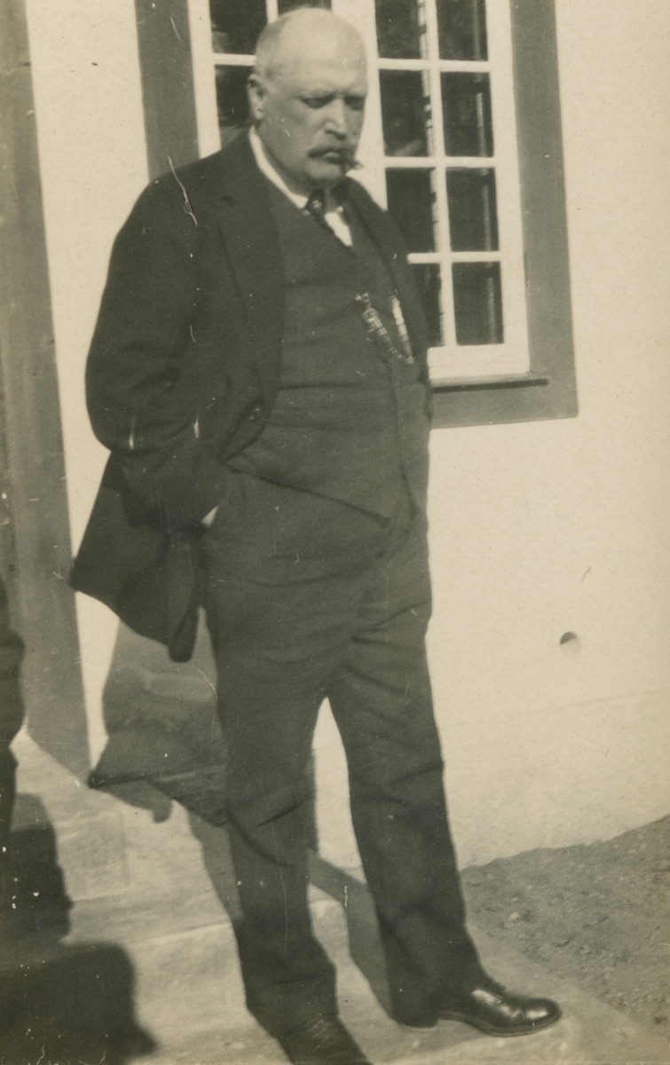 Fotografi från expedition till Spetsbergen. Motiv av finklädd äldre man med mustasch som står utanför ett hus.