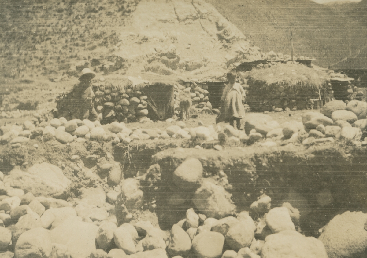 Fotografi från expedition till Peru 1920. Motiv av två barn vid stenhydda i bergen.