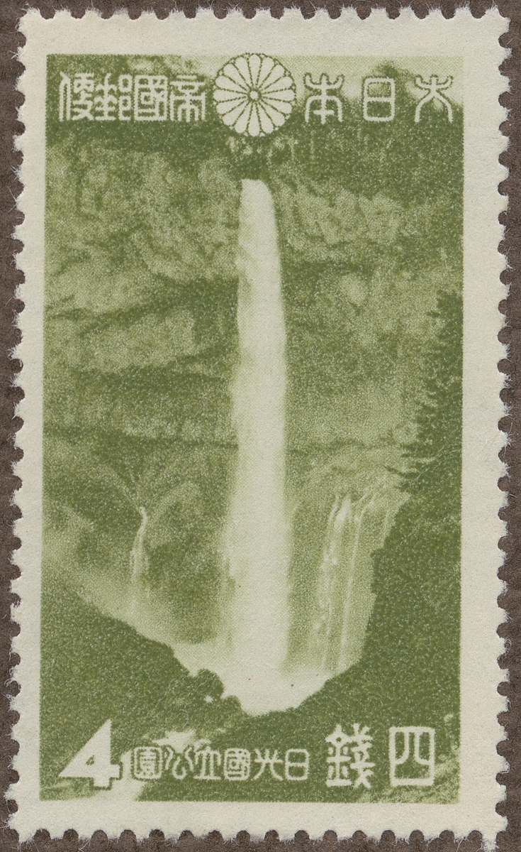 Frimärke ur Gösta Bodmans filatelistiska motivsamling, påbörjad 1950. Frimärke från Japan, 1938. Motiv av Vattenfallet "Kegon" "Serie: Nationalparker.-"