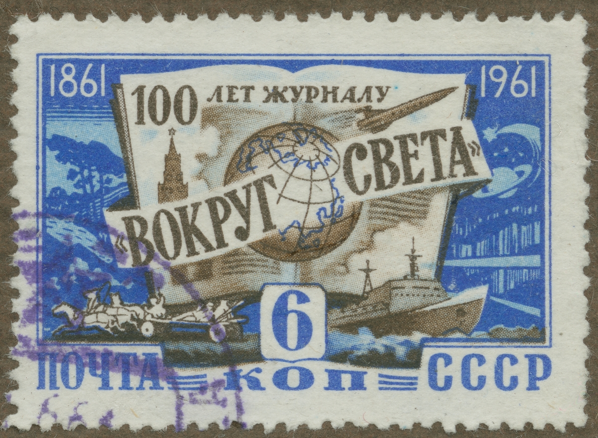 Frimärke från Ryssland, 1961. Motiv av jordglob och tekniska tidsskriften: omkring Jorden. " 100-årsjubileum: 1861-1961".