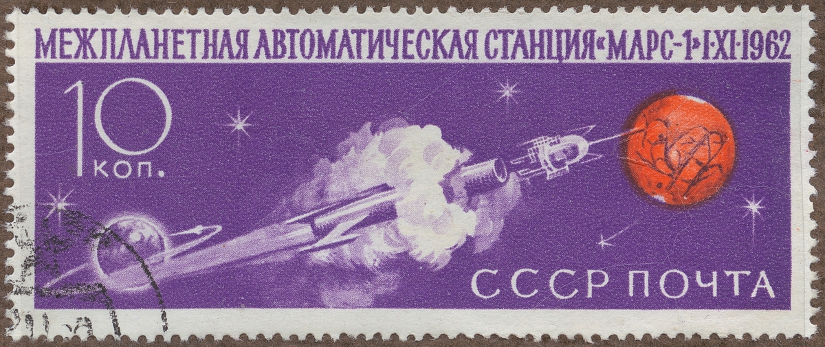 Frimärke från Ryssland, 1962. Motiv av Automatisk station mellan planeterna: "Mars 1": 1-XI-1962. Jämte en dubblett, ostämplad på brev med rymdmotiv.