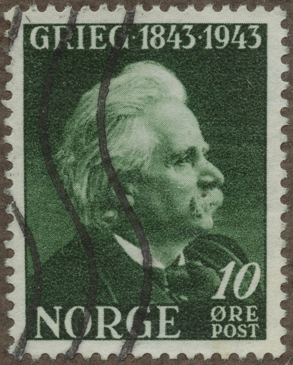 Frimärke från Norge, 1943. Motiv av Edvard Grieg 1843-1907 Norsk kompositör 100-årsminne av hans födelse: 1843-1943