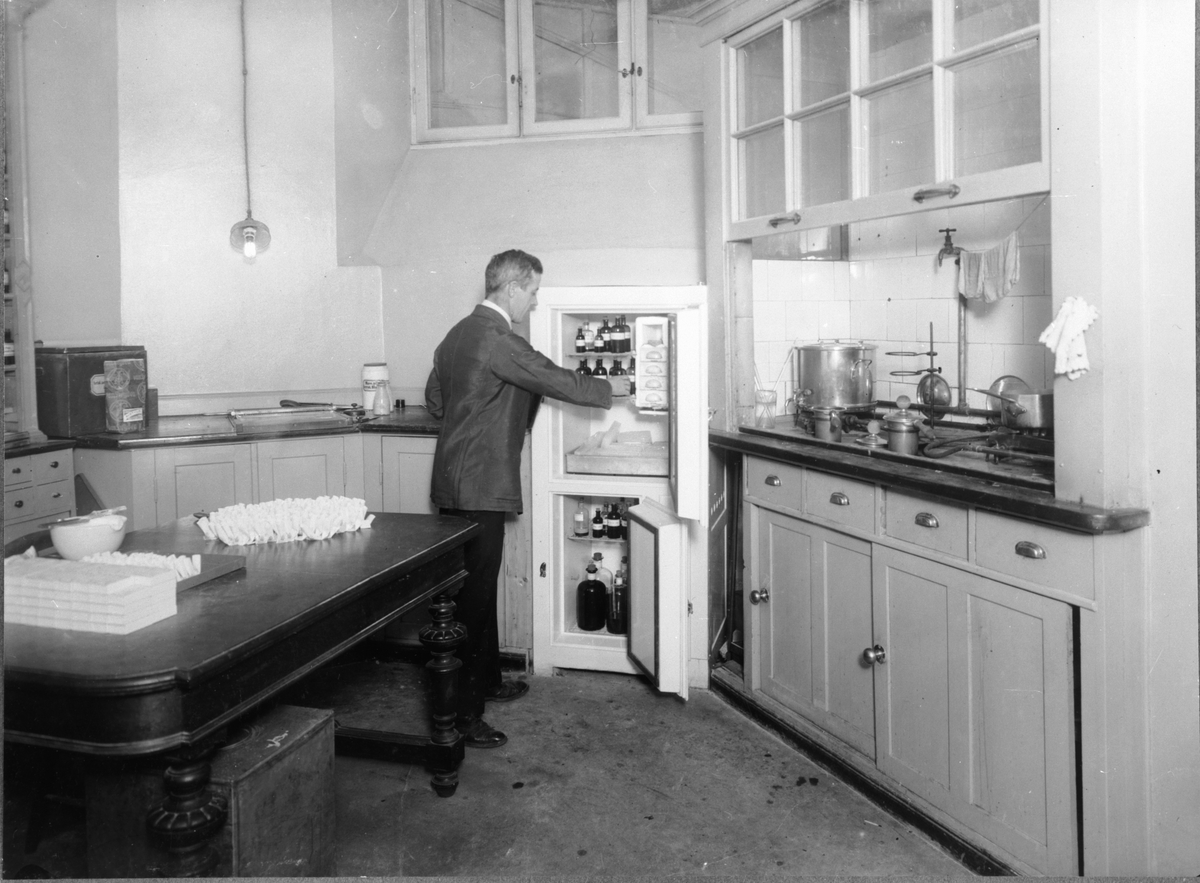 En gammal kylskåpsmodell i köksmiljö.
