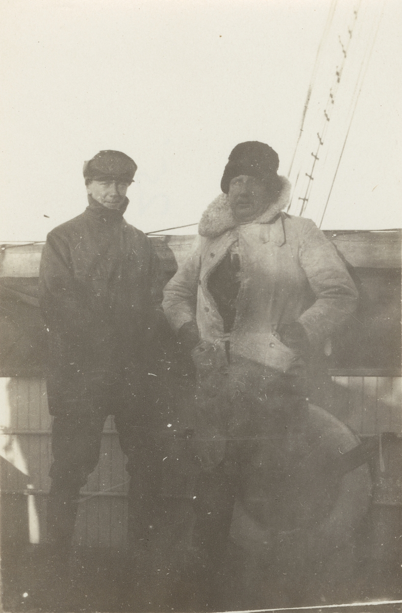 Fotografi från expedition till Spetsbergen. Motiv av två män som poserar ombord på ett skepp.