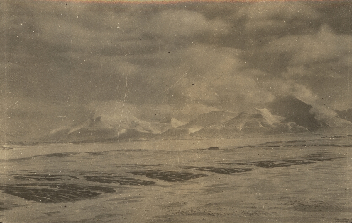 Fotografi från expedition till Spetsbergen. Vy över ett vidsträckt islandskap med stora snötäckta berg i bakgrunden.