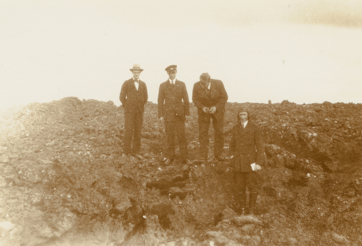 Fotografi från Albin Ahrenbergs resa till Grönland 1929. Motiv av fyra män i ett stenigt bergslandskap.