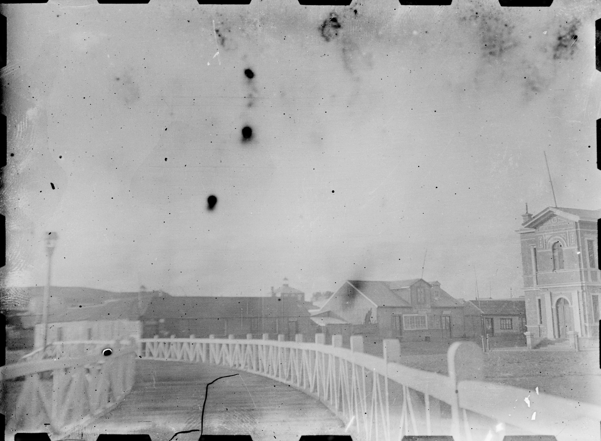 Fotografi från Eldslandet. Motiv av hus i stad.