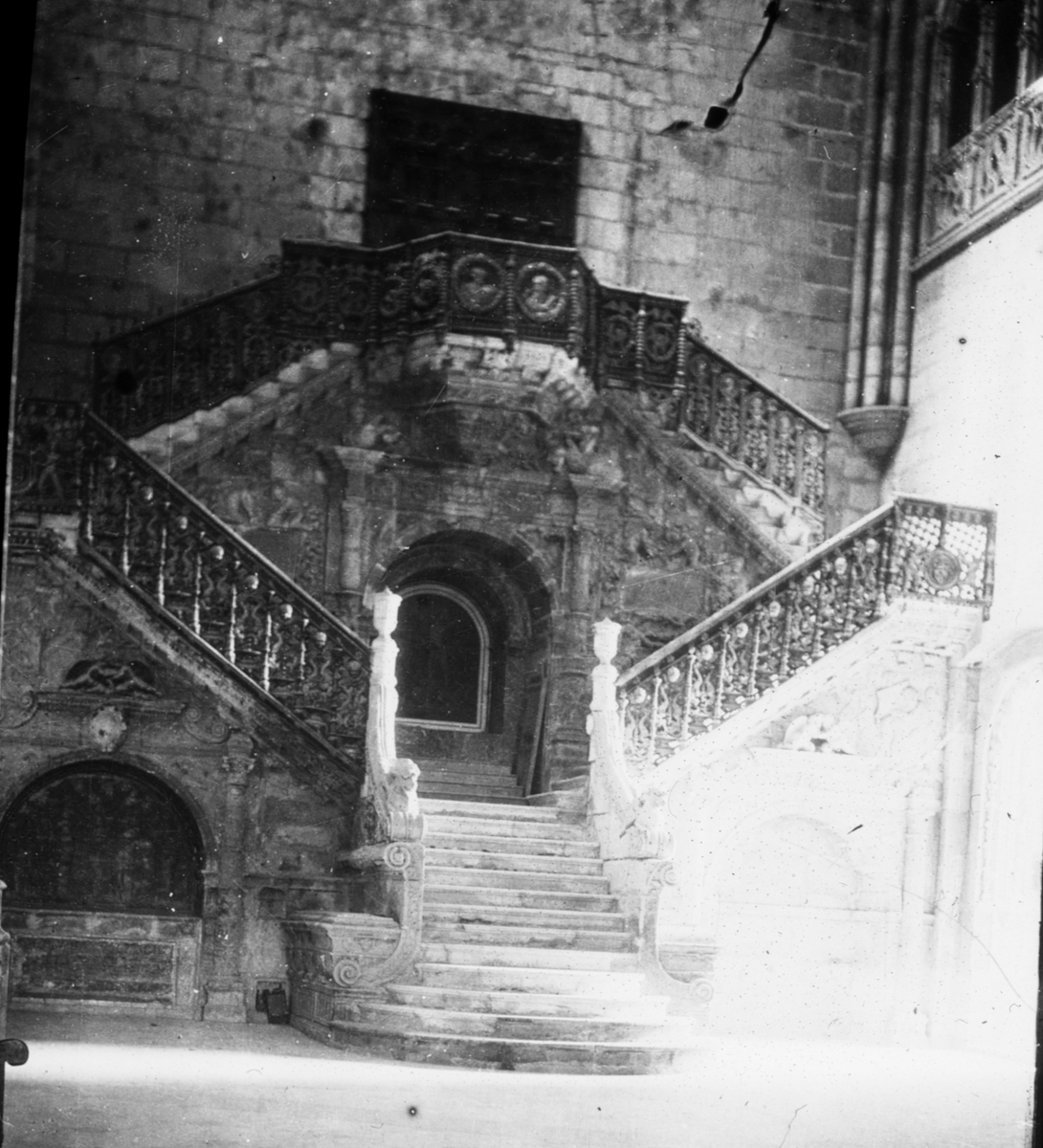 Skioptikonbild med motiv från Sigurd Curmans resor i Europa. Okänd byggnad i okänd stad, Spanien.