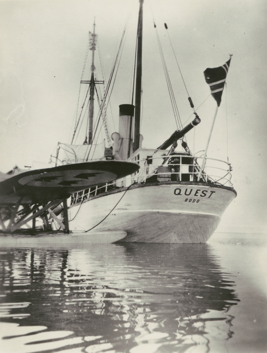 Fotografi från svenska undsättningsexpeditionen 1928. Motiv av fartyget "Quest" och en flygbåt.