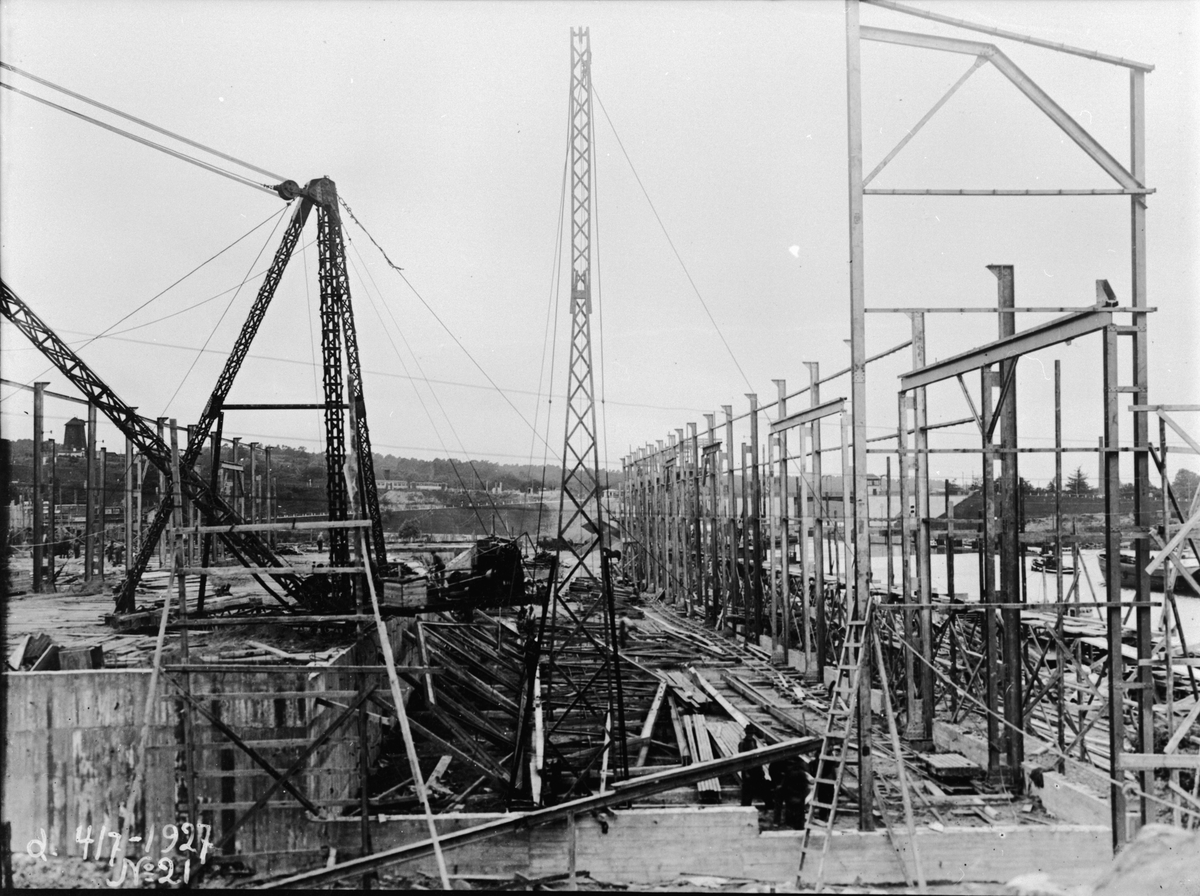 Byggherre: Bygnadaktiebolaget Contractor, Stockholm. General Motors Nordiska AB:s första fabriksbyggnad i Sverige. Arbetsbild. Hammarbyhamnen 1927.