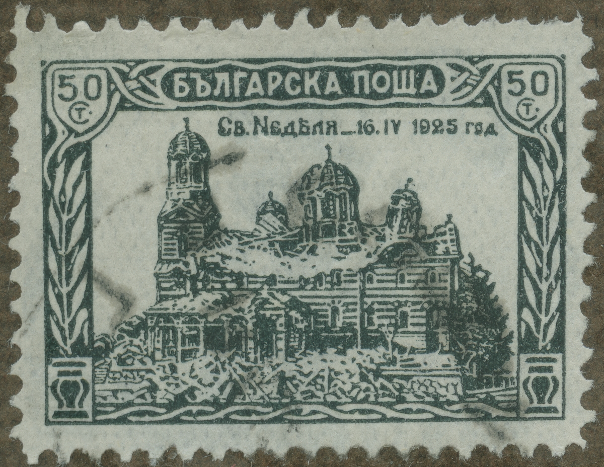 Frimärke från Bulgarien, 1925. Motiv av Sveta Nedelya Katedralen i Sophia efter bombattentat 1925.
