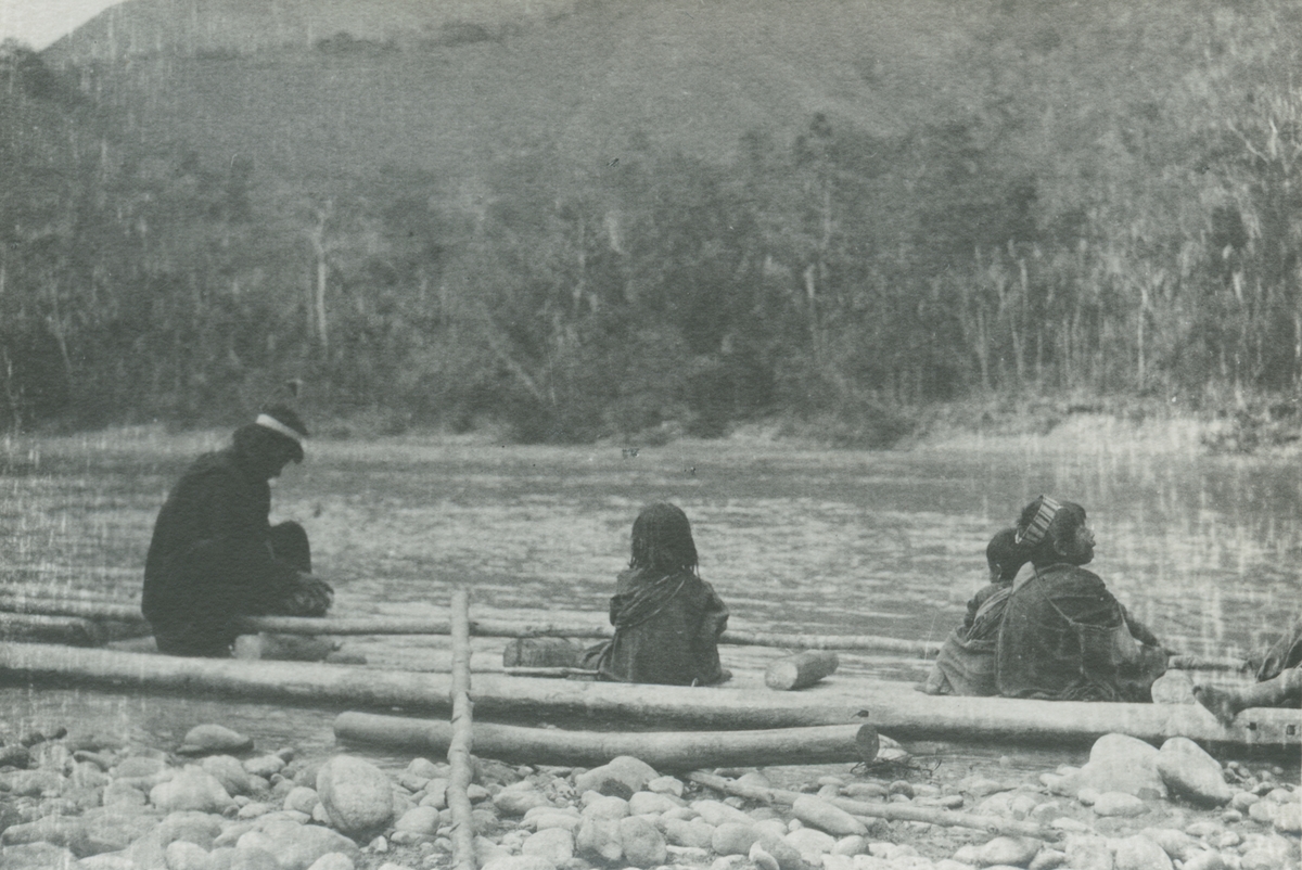 Fotografi från expedition till Peru 1920. Motiv av en man och tre barn som sitter på stenig strand vid flod i djungeln.