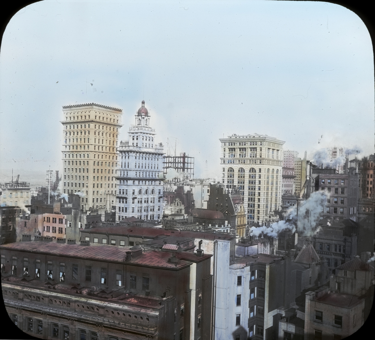 Kolorerad ljusbild, vy över stad, troligen New York, möjligen Chicago?