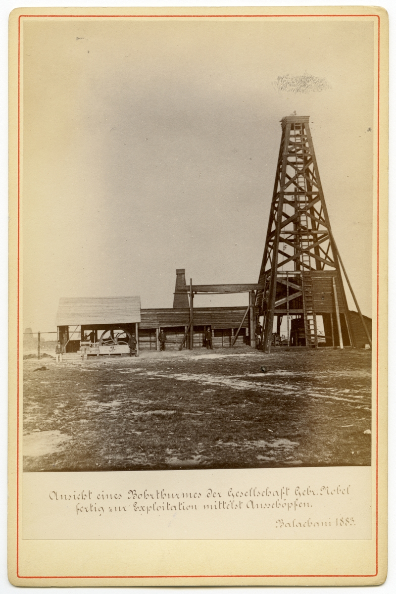 Vy över en av Bröderna Nobels aktiebolags borrtorn - för utvinning av olja genom pumpning (Ausschöpfen). Balachani 1883..(Mer text finns på baksidan av fotografiet).