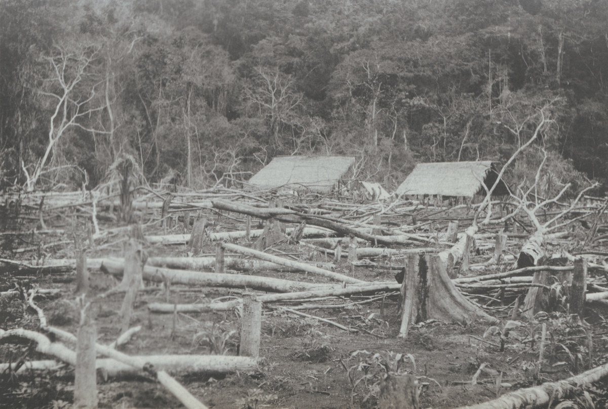 Fotografi från kuvert märkt med "Ernst Nordenskjöld". Motiv av skövlad skog och två hyddor i djungel.
